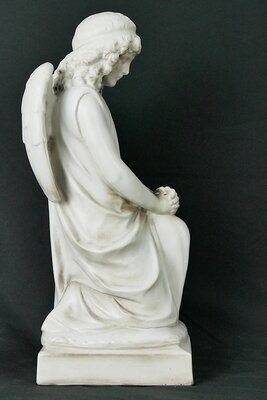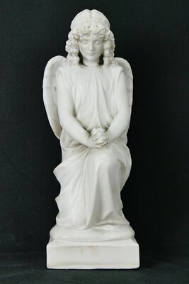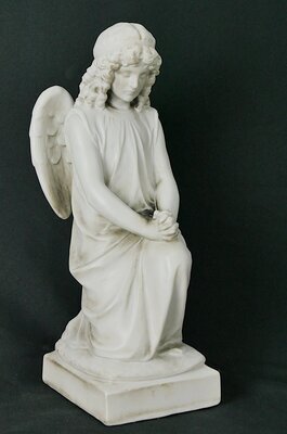 Kleiner weißer sitzender Friedhofsengel (Grabengel) aus Steinguss. Der Blick der geschlossenen Augen geht nach unten. Der Engel besitzt zwei große Flügel, trägt ein langes Kleid. Die auf dem Knie aufgestützten Hände sind zum Gebet gefaltet. Die Figur ist auf einem Sockel befestigt.