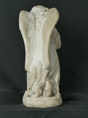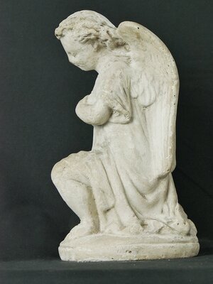 Kleiner, weißer, sitzender Grabengel (Friedhofsengel) aus Keramik. Der Blick der geschlossenen Augen geht nach unten. Der Engel besitzt zwei große Flügel und trägt ein mittellanges Kleid. Aus diesem schauen das linke Bein vom Knie bis zum Fuß sowie das rechte Knie, auf dem der Engel kniet, heraus. Die Hände des Engels sind auf der Brust übereinander gelegt. Unter der Figur ist eine runde Platte, die den Erdboden symbolisiert. Die weiße Fassung ist teilweise abgängig.