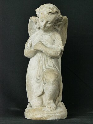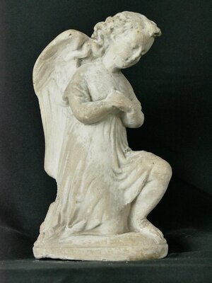 Kleiner, weißer, sitzender Grabengel (Friedhofsengel) aus Keramik. Der Blick der geschlossenen Augen geht nach unten. Der Engel besitzt zwei große Flügel und trägt ein mittellanges Kleid. Aus diesem schauen das linke Bein vom Knie bis zum Fuß sowie das rechte Knie, auf dem der Engel kniet, heraus. Die Hände des Engels sind auf der Brust übereinander gelegt. Unter der Figur ist eine runde Platte, die den Erdboden symbolisiert. Die weiße Fassung ist teilweise abgängig.