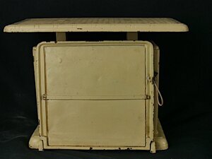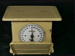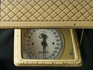 Konstruktionsbedingt sehr kleine Personenwaage (Spiegelwaage). Die zu wiegende Person konnte sich auf die Platte oben auf der Waage stellen und das eigene Gewicht im Spiegel ablesen. Dazu wurde das von der Person aus nicht sichtbare und unter dieser angebrachte Ziffernblatt spiegelverkehrt beschriftet. Auf dem unten an der Waage angebrachten, aufklappbarer Spiegel, der mit einer Kette in Position gehalten wird konnte dann das eigene Gewicht abgelesen werden. Es können maximal 125 kg gewogen werden.