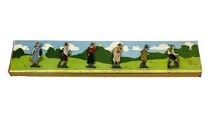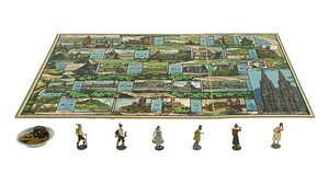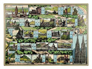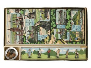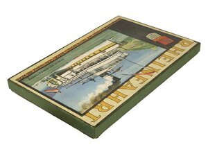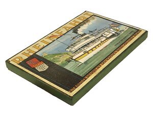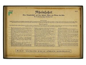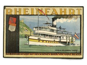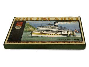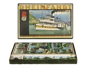 Gesellschafts-/Brettspiel "Rheinfahrt" im Karton mit einem Spielbrett (einseitig farbig bedruckt für maximal sechs Personen), sechs Zinnspielfiguren, einem Würfel, Spielgeld und einem kleinen Aluminiumtellerchen, hergestellt vom Mainzer Joseph Scholz Verlag (Nr. 475 bzw. 5336) um etwa 1921. Es handelt sich bei dem Spiel um "eine Dampferfahrt auf dem schönen Rhein von Mainz bis Köln", wie es auf dem Kartondeckel heißt. Neben den Spielregeln (Innenseite des Kartondeckels) werden die insgesamt 55 Ortschaften und Burgen kurz erklärt. Das Spiel gehört zu den "Scholz` künstlerischen Spielen" mit der Nummer 5336. Auf der Innenseite des Kartondeckels befindet ein kleiner Teil des ehemaligen Berliner Spielwarengeschäfts (Dlouhy,W., Puppenklinik, Turmstr. 14., Berlin)