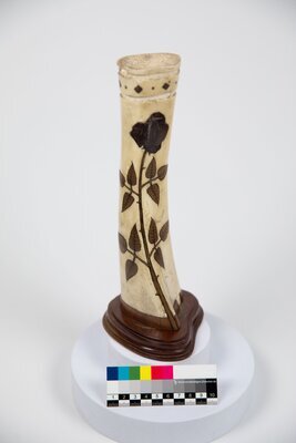 Knochenschnitzerei aus dem Internierungslager Isle of Man: 1 Vase mit Rose (intarisert?), H. 25 cm, Ludwig Knaul, Hinzweiler