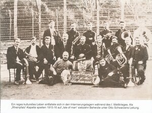 Ein reges kulturelles Leben entfaltete sich in den Internierungslagern während des I. Weltkrieges. Als „Rheinpfalz“-Kapelle spielten 1915-16 auf „Isle of man“ siebzehn Beherzte unter Otto Schwarzens Leitung. (PE)