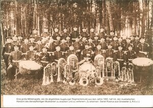 Eine große Militärkapelle, wie die abgebildete Augsburger Regimentsmusik aus dem Jahre 1895, half mit, den musikalischen Horizont des dienstpflichtigen Musikanten zu erweitern und zu verfeinern. Zu erkennen: Daniel Rosinus aus Ginsweiler (L.R.5.v.l.). (PE)