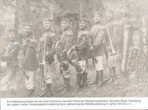 Eine Besetzung dieser Art war wohl Vorbild so mancher Partie der Wandermusikanten. Hermann Rech, Etschberg, der später in einer Grubenkapelle Anstellung fand, während seiner Militärausbildung im Jahre 1910 (5.v.l.). (PE)