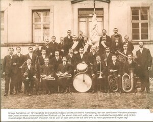 Unsere Aufnahme von 1910 zeigt die einst stattliche Kapelle des Musikvereins Rothselberg, der den zahlreichen Wandermusikanten des Ortes Lehrstätte und wirtschaftlichen Rückhalt bot. Der Verein löste sich später auf – alle musikalischen Aktivitäten sind mit ihm im ehemaligen Musikantendorf erloschen. Ob es wohl an dem Verlust der auf der Fahne so hoch gepriesenen Einigkeit lag? (PE)