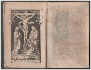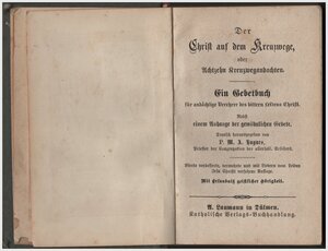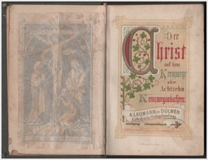 Ein Gebetbuch mit geprägter Vorder- und Rückseite aus mit schwarzer Leinen überzogener Pappe. In der Vorderseitenprägung ist mittig im goldfarbenen Druck ein Kreuz mit Blumenranken aufgedruckt. Auf der zweiten Seite ist mit Bleistift eine nicht mehr lesbare Widmung geschrieben, die 1876 erfolgte. Das Gebetbuch ist gedacht für anständige Verehrer des bitteren Leidens Christi mit auf den ersten Seiten zwei Bilder, Kreuzigungsszene und der grafisch gestalteten Titelseite von L. Wiegand in Münster mit der Überschrift und dem herausgebenden Verlag A. Laumann in Dülmen, Katholische Verlagshandlung. Herausgegeben wurde das Gebetbuch ursprünglich in holländischer Sprache und vor der Übersetzungs in die deutsche Sprache bereite in Holland und Belgien in vielen Auflagen herausgegeben. Auf Bitten der Oberen der "Congregation des allerheiligsten Erlösers" wurde das Buch vom Priester des Ordens P. M. A. Pugues, ins Deutsch übersetzt und am 25. Dezember 1856 in Dülmen in 'Deutsch Gothik Schrift' herausgegeben, damit auch deutsche Prister und Laien es verwenden konnten. Im Nachwort zum Vorwort schreibt der Verlegen mit Datum, Luxemburg am Feiertag Empfängnis Marieä (8. Dezember) 1877: "Es gereicht dem Herausgeber dieses Büchleins zur großen Freude, daß dasselbe, namentlich seit der Verfolgung unserer heiligen Kirche im deutschen Vaterland, eine so große Verbreitung gefunden hat, daß im Laufe von zwei Jahren eine neue Auflage nothwendig ward. Möchte doch das Gebet so vieler frommen Schriften an den Leidensstätten des Herrn dazu beitragen die Tagr der Prüfung abzukürzen! Diese neue Auflage haben wir noch zwei kurze Kreuzwegsandachten beigefügt und das Ganze einder sorgfältigen Durchsicht unterworfen." Im Buch eingelegt ein vierseitiges Heftchen "Lobgesang zu Ehren des h. Marthrers Sebastian" (inventarnummer 2501_D_1-06).