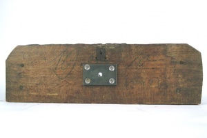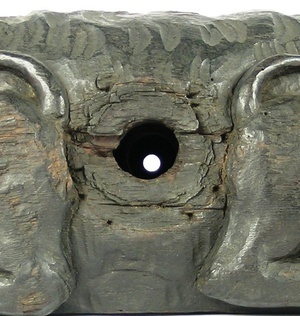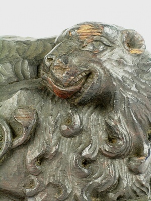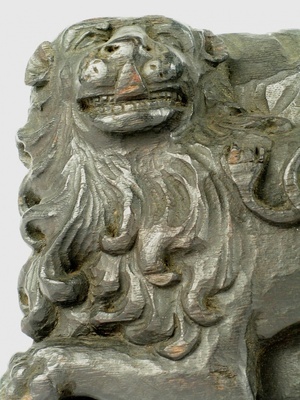 Fassriegel mit zwei Löwen, Hochrelief, auf den Ecken und über Eck die stark plastischen Löwenköpfe und die Pfoten, der linke Löwe wendet den Kopf ziemlich frontal, der rechte rückwärts hin zu seinem Gegenüber, die geteilten Schwänze kreuzen sich über den Leibern
