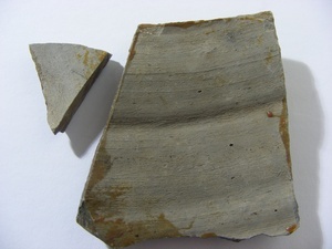 Fränkische bzw. merowingerzeitliche Tongefäßfragmente mit Stempelzier; schwarze Scherbe; gehört eventuell zu Inventar 1.175