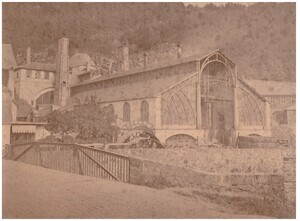 Fassriegel, in der Mitte Segmentbogen nach vorne geschwungen, an den Enden mit je einer männlichen Maske. Die Ränder des Bogens mit Kerbschnitt (Schuppenband) geziert. Die Masken treten als halbe Köpfe vor die Unterlage. Ein Blatt in Palmettenform bildet das Haar und führt zur breiten Nase über, Schnurrbart, weit heraugestreckte Zunge; Bez. auf der Unterseite: 1705 FS