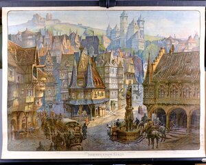 Das Foto zeigt ein auf Leinen kaschiertes Schulwandbild für Geschichte aus der Serie "Ad. Lehmann's kulturgeschichtliche Bilder" (1880 – ca.1935). Abgebildet ist fiktiver mittelalterlicher Stadtkern des XV. Jahrhunderts in der Vorstellung des Historismus. Es ist eigentlich kein realer Stadtkern, sondern eine Ansammlung von Prachtbauten verschiedener Städte. Die linke Seite des Bildes wird von einem repräsentativen Kaufmannshaus dominiert, was der eingebaute Aussenkrahn vermuten lässt. Davor ein vollgeladenes Pferdegespann. In der Bildmitte ein Gasthaus. Hier hat sich der Maler, Joseph Ferdinand Klemm (1868-1916), vermutlich an einem realen Vorbild orientiert. Eine Ähnlichkeit mit dem historischen Rathaus in Michelstadt ist jedenfalls erkennbar. Der abgebildete Brunnen, an dem einige Söldner ihre Pferde tränken, hat, ebenso wie das dahinter liegende Rathaus, eine Ähnlichkeit mit dem historischen Stadtzentrum von Bremen. Im Hintergrund ist eine große Kirche sowie eine Burg erkennbar.