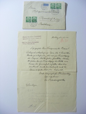 Briefumschlag mit Brief von Friedrich Baumgarten vom Verein Deutscher Ingenieure Mittelrheinischer Bezirks-Verein e. V. vom 01.08.1955 an den Bürgermeister der Stadt Bendorf, Herrn Bauer; Durchschlag des Antwortschreibens des Bürgermeisters vom 02.08.1955;