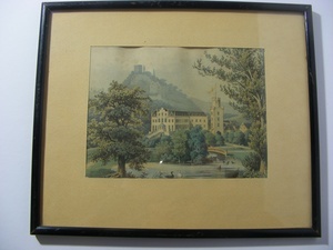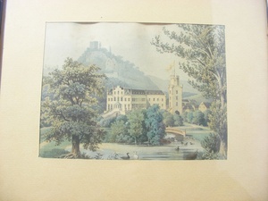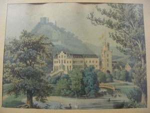 Ansicht von Schloss, Park und Burg Sayn nach dem Erwerb und Umbau durch Fürst Ludwig zu Sayn-Wittgenstein-Berleburg-Ludwigsburg (1799-1866). Kolorierte Lithographie, um 1850. Im Vordergrund der Schlosspark mit Teich und Brücke, dahinter das über eine Freitreppe mit dem Park verbundene Schloss Sayn und der Turm der ehemaligen Stadtmauer. Im Hintergrund ist der sog. Kehrberg mit der Burg Sayn und den Burgmannenhäusern erkennbar. vergleiche Inv.-Nr. 2.091;