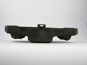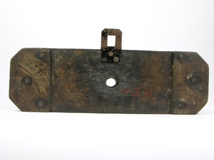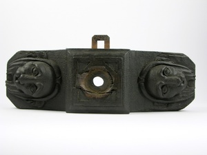 Fassriegel mit nach vorn springender, quadratisch gestalteter Mittelscheibe und an den Ecken querliegenden Löwenköpfen. Form ist kürzer und leichter als die Fassriegel-Formen des 18. und 19. Jahrhunderts. An der Bildung der Ohren beim Löwen links ist eine Datierung möglich: knorpelwerkartig (= Indiz für 17. Jahrhundert).