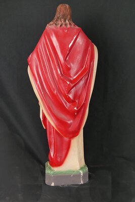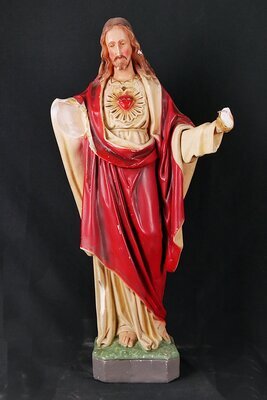 Das Besondere an dieser Figur ist, dass sie nicht bemalt sondern mit Farbe besprüht wurde und demnach erst am Ende des Herz-Jesu Booms entstanden sein dürfte. Auch stilistisch weist sie in die erste Hälfte des 20. Jahrhunderts. Die Verehrung des Heiligsten Herzens Jesu ist eine Ausdrucksform der römisch-katholischen Spiritualität. Dabei wird das durchbohrte Herz des Gekreuzigten als Quelle der Sakramente der Kirche verehrt. Die Jesusstatue steht auf einem Sockel. Christus ist mit langem gewellten Haar und Bärten dargestellt. Er trägt eine Tunika und darüber ein rotes Tuch mit goldenem Randstreifen und grüner Rückseite. Christus zeigt Wundmale an Händen und Füßen. Auf seiner Brust befindet sich ein rotes, golden brennendes Herz in einem Strahlenkranz. Quer über das Herz läuft ein goldenes Ornament (die stilisierte Dornenkrone?). Die Verehrung des Herzen Jesus geht bis auf das frühe Mittelalter zurück. Die neuzeitliche Verehrung des Herzen Jesu gründet sich auf den vier Visionen der französischen Ordensfrau Margareta Maria Alacoque zwischen dem 27. Dezember 1673 und 1675 zurück. Einen Höhepunkt fand die Verehrung in der zweiten Hälfte des 19. und am Anfang des 20. Jahrhunderts. In diesem Zeitraum entwickelte sich der heute verbreitetste ikonographische Typus, der Jesus mit sichtbarem Herzen zeigt, meist mit Segensgestus oder indem er auf das Herz weist.