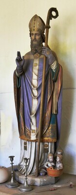 Die Pietà, auch Vesperbild oder Marienklage genannt, ist in der bildenden Kunst die Darstellung Marias als Mater Dolorosa (Schmerzensmutter) mit dem Leichnam des vom Kreuz abgenommenen Jesus Christus. Die frühesten erhaltenen Darstellungen einer Pietà werden in die ersten Jahrzehnte des 14. Jahrhunderts datiert. Darstellungen der Pietà gibt es seither aus allen Jahrhunderten. Plastiken der Pietà wurden auch in der Hochphase der religiösen Terrakotten und Gipsfiguren - etwa von 1860 bis 1920 - geschaffen. Die Entwürfe und die Fassungen orientierten sich dabei stark an mittelalterlichen Vorbildern. Die teilweise zerbrochene Pietà aus Ton ist bei Walter (als Modell 174 im Produktkatalog von 1914) im Jahr 1906 und 1914 nachweisbar. Der Entwurf von Carl Walter im neugotischen Stil stammt aus der Zeitzwischen 1871 und spätestens 1880 . Für die Ausformung durch die Anstalt für kirchliche Kunst Trier (Carl Walter) kann der Zeitraum zwischen 1871 und 1914 angenommen werden. Die Pietà lässt sich im Katalog der Anstalt für kirchliche Kunst Trier als Modell 174 im Jahr 1906 und wieder 1914 nachweisen. Die Pieta zeigt eine eher seltenere Haltung: Der Kopf Christi zeigt nach links und sein Körper ist sehr gerade. Der Kopf Mariens und die Beine Christi sind abgebrochen und nur noch teilweise in Bruchstücken erhalten (siehe 2. Foto). Das 4. Foto zeigt die Pieta im Katalog von 1914. Die Höhe der Pietà wird (für den unbeschädigten Zustand) mit ca. 55 cm angegeben. Je nach Aufwand der fünf möglichen Farbfassungen kostete sie zwischen 45 und 120 Mark. Bei der vorliegenden Piéta wurde für die Fassung die mittelpreisige Alternative "Polychromiert mit Vergoldung der Gewandsäume" gewählt.