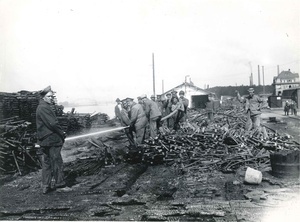 Schwarzweißfotografie. Diese Aufnahme zeigt einige Männer bei Aufräumarbeiten im amerikanischen Armeemagazin im Bendorfer Rheinhafen am 30.12.1919. Laut Bendorfer Zeitung war das amerikanische Öllager während des Hochwassers 1919/1920 abgebrannt. Im Hintergrund ist das ehemalige Empfangsgebäude der Dampfschifffahrt, auch "Schlackehotel" genannt, zu erkennen.