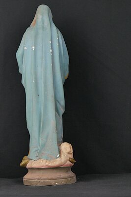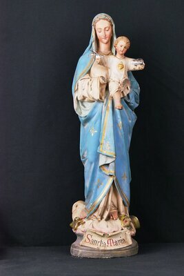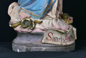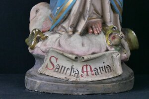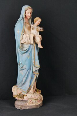 Gipsfigur mit der Darstellung von Maria mit Kind. Maria trägt mit der linken Hand das Jesuskind. Sie trägt von innen nach außen eine weiße Tunika und darüber einen außen mit goldenen Sternen übersäten hellblauen und innen weißen Mantel. Das Jesuskind ist weiß gekleidet. Auf seiner Brust ist als die Herz-Jesu Symbol ein goldenes Herz im Strahlenkranz mit quer über das Herz laufender Dornenkrone sowie über dem Herz stehendem Kreuz. Maria steht mit ihren Füßen auf einer Wolke. Um diese windet sich eine grüne Schlange mit Evas Apfel in ihrem Maul. Vor der Wolke und dem kreisrundem Sockel befindet sich ein Spruchband mit der Aufschrift "Sancta Maria".