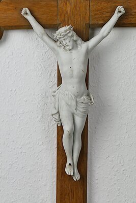 Kruzifix aus dem 19. Jahrhundert. Das Wandkreuz besteht besteht aus Eichenholz in der klassisch neugotischen Form des Laurentiuskreuzes mit 4 Passen (Kleeblättern) an den Enden der Balken. Der Corpus ist aus Biskuitporzellan gefertigt. Die Arme sind etwa im 45°-Winkel nach oben ausgestreckt. Das linke Bein baumelt ausgestreckt herunter. Das rechte Bein ist leicht angewinkelt. Sein Fuß ist am Längsbalken angenagelt. Oben am Längsbalken hängt der Titulus crucis (die INRI-Tafel) in Form einer römischen Feldstandarte, wobei dieses mit einem Nagel am Kreuz befestigt ist.