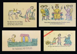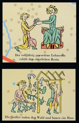 Diese Schulwandtafel unterstützte den Geschichtsunterricht. Zu sehen ist die räumliche Verbindung des Ostens mit der Abendländischen Kultur, auf Grund der geltenden (Stadt)Rechte. Sie ist Teil der Bildkartenwerke "Der Deutsche Osten" herausgegeben und bearbeitet von Dr. Erwin Nadolny, Hannover. Das Stadtrecht im 12. Jhd. war noch kein statisches Gesetzeswerk, sondern eine mündliche/schriftliche Sammlung von Gewohnheitsrechten, geltenden Normen und Rechtsvorstellungen. Aussteller eines Stadtrechts waren der Kaiser oder der Papst. Auf dieser Karte ist die Verbreitung der Stadtrechtsfamilien von Lübeck (1143), Magdeburg (1150) und Nürnberg 1062) wiedergegeben. Als Stadtrechtsfamilien wird der Zusammenschluss von Städten bezeichnet, die sich dem Recht einer großen Stadt, wie z.Bsp. Magdeburg, angeschlossen haben. In diesem Fall galt dann das Magdeburger Recht. Die roten Linien in der Karte verdeutlichen die enorme Ausdehnung nach Osten, bis zu den Städten Danzig, Königsberg, Minsk, Smolensk im NO und bis nach Kiew und Lemberg im Osten von Magdeburg aus. Auf der Bildtafel sind einige der geltenden Rechte, als kleine Bildzeichnungen dargestellt. So erfahren wir z.Bsp. dass ein Reisender soviel Futter für sein Pferd schneiden darf, wie er mit einem Fuß fest auf dem Weg stehend, erreicht. (siehe Bilder)