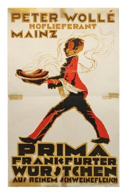 Eine Werbefigur „Eilender junger Mann“ trägt eine Platte mit dampfenden „Frankfurter Würstchen“. Darüber orthogonal dreizeilig die Schrift PETER WOLLÉ HOFLIEFERANT MAINZ Darunter steht ebenfalls orthogonal vierzeilig die Aufschrift "PRIMA FRANKFURTER WÜRSTCHEN AUS REINEM SCHWEINEFLEISCH". Das Plakat wurde 1928 gedruckt, ist auf der Rückseite vom Künstler Carl Ries handsigniert und mit der Nr. 13 bezeichnet. Gedruckt wurde es von der Mainzer Druckerei E. Herzog
