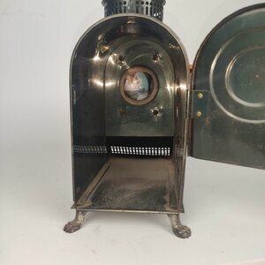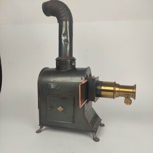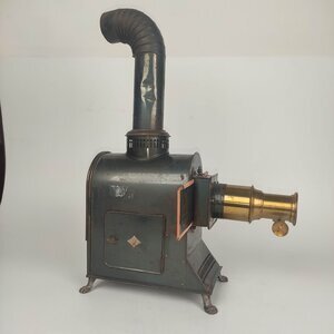 Die Laterna magica ist eine Projektionsvorrichtung zur Darstellung von Glasbildern auf einer Leinwand. Sie war quasi der Vorgänger der noch vor 30 Jahren verwendeten Diaprojektoren. Es handelt sich dabei um einen Kasten mit einer Öffnung vorne, in dem sich eine Lichtquelle befindet – im 17. Jahrhundert zunächst eine schlichte Kerze oder Öllampe, später eine elektrische Lampe. Dieses Licht dringt durch das eingeschobene Glasbild und ein Linsensystem an der Vorderseite des Kastens nach außen und projiziert das Bild auf eine Leinwand. Die hier gezeigte Laterna magica wurde um die Jahrhundertwende ( 1900 ) von der Firma Bing aus Nürnberg hergestellt.