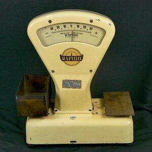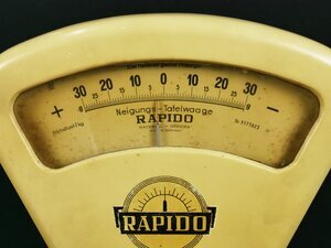 Neigungswaage / Kaufmannswaage der Firma VEB Wägetechnik RAPIDO aus Radebeul. Die auf vier Füßchen stehende Kaufmannswaage ist eine Mischung aus Tafelwaage und Neigungswaage. Sie besitzt auf der einen Seite eine Schüssel für das Wägegut, und auf der anderen Seite eine Tafel, auf die Gewichtsstücke gestellt werden können. Zeigt der Zeiger nach Beladen der Waage auf einen Wert in der Skala (und nicht links oder rechts neben diese), so zeigt er den Unterschied zwischen dem Gewicht des Gewichtsstücks und dem des Wägeguts an. Das Gewicht des Wiegeguts kann damit errechnet werden. Das beidseitige Ziffernblatt reicht von -30 g bis +30g und besitzt als kleinste Maßeinheit je einen Strich für 0,5 g. Die maximal zulässige Last für diese Waage ist 2 kg. Im Vergleich zur Benutzung einer reinen Tafelwaage ermöglicht diese Waage eine erhebliche Zeitersparnis, da nicht mühsam mit kleinen und kleinsten Gewichtsstücken hantiert werden muss. Wir bedanken uns beim Landesamt für Mess- und Eichwesen Rheinland-Pfalz für die Informationen zum Eichwesen.