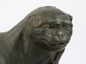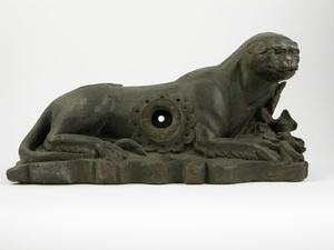 Vollrund geschnitzt als nach rechts neben einem Strauch liegender Leopard. Bodenplatte mit profilierter Kante. Schraubenscheibe mit einer Rosette besetzt.
