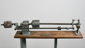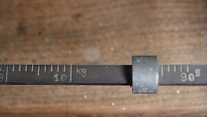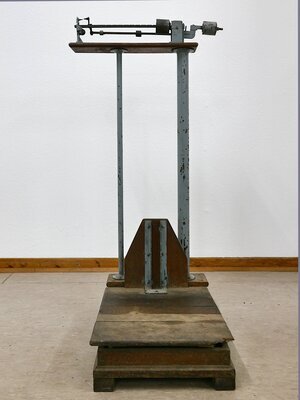 Als Laufgewichtswaage realisierte Güter und/oder Personenwaage. Auf dem Boden steht eine Plattform um auf dieser den zu wiegenden Gegenstand bzw. die zu wiegende Person zu stellen. In gut 1 Meter Höhe befindet sich die Mechanik der Waage mit 2 Skalen und 3 Laufgewichten. Die beiden Skalen können so erklärt werden: - Hauptskale: zeigt das Gewicht in 1 kg-Schritten bis max 110 kg - Nebenskala: zeigt das zusätzliche Gewicht in 100g bis max 10 kg. Am rechten Rand der Skala befindet sich ein Tariergewicht. Oben auf der Aufhängung des Waagbalkens ist die Produktionsnummer 52301 eingeschlagen. Einer Plakette zeigt 6 Punzen. Die linke Punze mit Stern und Krone zeigt das Herstellerlogo der Firma Trayvou-Usins de la Mutière (Béranger) aus Lyon. Die Buchstaben stehen bei französischen Waagen für Jahreszahlen der Eichung (in mehreren Durchgängen..). Das K könnte hier für 1850, 1863 oder 1876 stehen. Das N für 1879 oder 1905. Möglicherweise wurde die Waage im Jahr N renoviert oder umgearbeitet. Die Initialen A.W. und das Symbol (Muschel?, Vogel? ... ) der Punze rechts davon ließen sich leider keinem Hersteller zuordnen.