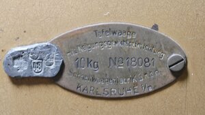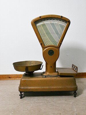 Kaufmannsschnellwaage als Zwischenschritt zwischen der Tafelwaage und der Neigungswaage. Die auf vier Schrauben-Füßchen stehende Kaufmannswaage ist eine Mischung aus Tafelwaage und Neigungswaage. Mit den Schrauben und mit Hilfe einer Libelle kann die Waage in die Waagrechte ausgerichtet werden. Die Waage besitzt auf der einen Seite eine Schale für das Wägegut, und auf der anderen Seite eine Tafel, auf die Gewichtsstücke gestellt werden können. Gewichte können in Kiloschritten bis max. 9 kg aufgelegt werden. Zeigt der Zeiger nach Beladen der Waage auf einen Wert in der Skala, so zeigt er den Unterschied zwischen dem Gewicht des Gewichtsstücks und dem des Wägeguts an. Das Gewicht des Wiegeguts ist somit die Summe des Gewichtssteingewichte des vom Zeiger angezeigten Werts . Wir bedanken uns beim Landesamt für Mess- und Eichwesen Rheinland-Pfalz für die Informationen zum Eichwesen.