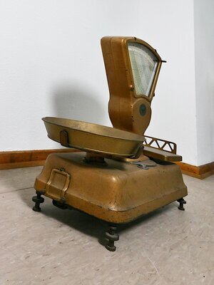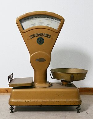 Kaufmannsschnellwaage als Zwischenschritt zwischen der Tafelwaage und der Neigungswaage. Die auf vier Schrauben-Füßchen stehende Kaufmannswaage ist eine Mischung aus Tafelwaage und Neigungswaage. Mit den Schrauben und mit Hilfe einer Libelle kann die Waage in die Waagrechte ausgerichtet werden. Die Waage besitzt auf der einen Seite eine Schale für das Wägegut, und auf der anderen Seite eine Tafel, auf die Gewichtsstücke gestellt werden können. Gewichte können in Kiloschritten bis max. 9 kg aufgelegt werden. Zeigt der Zeiger nach Beladen der Waage auf einen Wert in der Skala, so zeigt er den Unterschied zwischen dem Gewicht des Gewichtsstücks und dem des Wägeguts an. Das Gewicht des Wiegeguts ist somit die Summe des Gewichtssteingewichte des vom Zeiger angezeigten Werts . Wir bedanken uns beim Landesamt für Mess- und Eichwesen Rheinland-Pfalz für die Informationen zum Eichwesen.