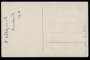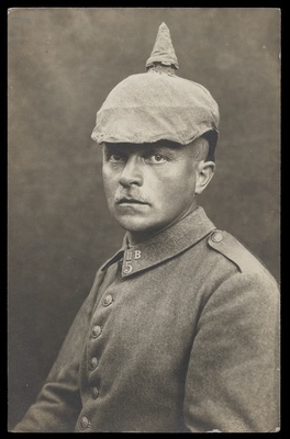 Porträtfotografie des Soldaten Daniel Wohlgemuth, Helm mit Tarnüberzug, Beschriftung Rückseite: "D. Wohlgemuth, Frankreich 1918"