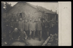 Gruppenaufnahme 21 Soldaten vor einer Baracke. Beschriftung Rückseite: "Ob Ihr mich findet?"