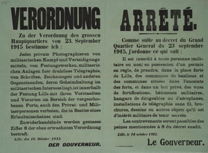 Wandanschlag in französischer und deutscher Sprache. Herausgegeben im von Deutschland besetzten Frankreich; Lille, den 11. November 1915. "Bekanntmachung Die Bestimmungen im Bulletin de Lille Nr 74 vom 29.7.15 und Nr. 80 vom 19.8.15 über die Gültigkeit von Stadtscheinen innerhalb des Gouvernementsbezirkes werden wie folgt abgeaendert : ’Die in den Arrondissements Arras, Cambrai, Douai, Lille und Valenciennes ausgegebenen Stadtscheine müssen von der Bevoelkerung ohne Rücksicht auf den Ausgabeort überall innerhalb des Gouvernementsbezirkes in Zahlung genommen werden. Einheimische, welche die Annahme solcher Scheine verweigern, koennen keine andere Zahlung beanspruchen’. Lille, den 11. November 1915. Der Gouverneur."