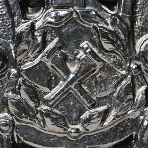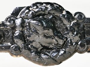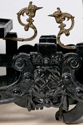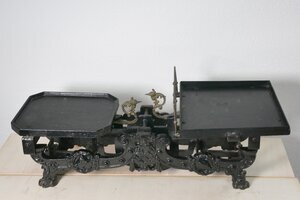Schwarze Tafelwaage und Schnabelwaage mit künstlerisch gestalteter Front- und Rückseite des Fußgestells. Das Besondere an dieser Waage ist das Dekor au Vorder- und Rückseite: Auf der linken Seite ist in einer Kartusche der Kopf eines Rinds, rechts, ebenfalls in einer Kartusche, der Kopf eines Schweins. In der Mitte der Waage sind ebenfalls in einer Kartusche die gekreuzten Schlachterbeile als (ein) Zunftzeichen der Metzger zu sehen. Die Waage ist (auch) eine Schnabelwaage bei der sich 2 Vogelköpfe mit je einem Schnabel gegenüberstehen. Sind die Schnäbel in gleicher Höhe, so ist die Waage im Gleichgewicht. In der Mitte der Waage steht der Schriftzug "20 kg". Die ist die Angabe des Höchstgewichts. Eine Tafelwaage unterscheidet sich von einer einfachen Balkenwaage durch die Gestänge im Inneren das bewirkt, dass das Moment am Waagebalken von der Position der Gewichte auf der Schale unabhängig ist. Auch werden Schrägstellung als auch Standortbewegungen bei der Béranger-Waage besser kompensiert, was die Nutzungsmöglichkeiten der Tafelwaage wesentlich erweitert. Wir bedanken uns beim Deutsches Fleischermuseum Böblingen für die Unterstützung bei der Inventarisierung dieser Waage.