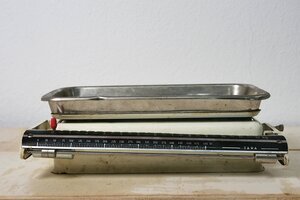 Laufgewichtswaagen sind asymmetrische Balkenwaagen. Dieses seit der römischen Schnellwaage bekannte Prinzip wurde in den Laufgewichts-Brückenwaagen weiterentwickelt. Mittels Verschieben der Gewichte auf der mit einer Messskala ausgestatteten Brücke kann das Gewicht des Wiegeguts ermittelt werden. Die Waage ist dann im Gleichgewicht, wenn der rechts an der Brücke angebrachte Marker auf gleicher Höhe wie der an der Waage fest angebrachte Marker ist. Die Waage ist bis 12,5 kg belastbar. Die Waage ist mit Ausnahme des schwarzen Zifferblatts weiß lackiert und steht auf einem Sockelchen. Die Schale, die Brücke und die Gewichte sind verchromt. Die Gewichtsskalen sind in weißer Schrift angebracht. Das Gewicht an der oberen Skala dient der auf 500 g genauen Voreinstellung. Mit der unteren Skala kann das Gewicht zusätzlich zum auf der oberen Skala eingestellten Wert auf 5 g genau abgewogen werden. Ebenfalls an der unteren Stange befestigt ist ein weiteres Laufgewicht mit dem ggf. das Tara voreingestellt werden kann. Links und rechts an der Waage sind Schrauben zu Kalibrierung angebracht. Die Gewichtsmessung erfolgt folgendermaßen: Die Schale wird mit dem Wiegegut gefüllt und drückt auf die unterhalb innerhalb des Gehäuses der Waage befindlichen Mechanik. Die Brücke klappt links nach unten und rechts nach oben. Das untere (große) Gewicht dient nun der "Grobeinstellung". Im Verlauf des Wiegens wird dieses so weit nach rechts verschoben, dass die Leiste mit der Skala gerade nicht nach rechts kippt. Das Gewicht lässt man nun bei der Aussparung der letzten davorliegenden Groß-Maßeinheit einrasten. Auf einer Schiene darüber befinden sich zwei weitere kleinere Gewichte. Das linke Gewicht dient beim Wiegevorgang zur bis auf 5 g genauen Feineinstellung. Das rechte Gewicht dient zur Eliminierung der Tara. D.h. mit diesem wird die Waage in das Gleichgewicht gebracht, wenn die anderen beiden Gewichte auf 0 stehen und auf der Waage ein Behälter steht in den das Wiegegut eingefüllt wird, und der nicht mit gewogen werden soll.