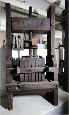 Funktionsweise: Um den Saft aus den Früchten (Äpfel, Weintrauben etc.) zu gewinnen, werden diese zuerst in einer (Trauben-)Mühle gemahlen. Danach wird die Maische (die kleinen Obst-Stücke einschließlich der Schalen und Kerne) in den Kelterkorb gefüllt. Dort werden sie durch Anwendung von Druck ausgepresst. Bei Spindelkeltern wird der Druck dadurch erzeugt, dass man die an einer Schraubenspindel befestigte Schraubenmutter nach unten bewegt. Gepresst wird indem der Kelterhebel - ein langes, rundes oder eckiges Stück Holz - in eine der Halterungen an der Spindel gesteckt wird. Der Nachteil dieses Systems ist, dass nach jeder etwa 1/4 Drehung der Kelterhebel herausgezogen und wieder neu eigesteckt werden muss. Besondere Eigenschaften dieses Objekts: Die Kelter ist eine Übergangsform zwischen der älteren Holzspindelkelter und der neueren Eisenspindelkelter. Möglicherweise besaß die Kelter früher eine Holzspindel die in der 2. Hälfte des 19. Jahrhunderts durch eine Metallspindel ersetzt wurde. Das Gestell, der Kelterhebel und der Kelterkorb sind aus dunkelbraun gebeiztem Holz, die Spindel und die Mechanik sind aus Eisen. Der Grund hierfür ist die Störungsanfälligkeit und die kurze Lebensdauer von Holzspindeln. Im massiven rechteckigen Biet stehen jeweils die losen Seckerbretter. Die vorderen Senckerbretter besitzen Schlitze durch die der Fruchtsaft abfließen kann. Durch diese läuft er beim Pressvorgang in eine Rinne, weiter in den Ablauf und durch diesen in ein hier nicht vorhandenes Auffanggefäß.