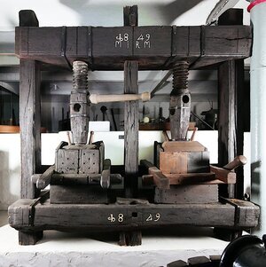 Funktionsweise: Um den Saft aus den Früchten (Äpfel, Weintrauben etc.) zu gewinnen, werden diese zuerst in einer (Trauben-)Mühle gemahlen. Danach wird die Maische (die kleinen Obst-Stücke einschließlich der Schalen und Kerne) in die Kelterkörbe oder - wie bei dieser Kelter in den Bietkasten - gefüllt. Dort werden sie durch Anwendung von Druck ausgepresst. Bei Spindelkeltern wird der Druck dadurch erzeugt, dass man die an der hölzernen Schraubenspindel befestigte Schraubenmutter je nach Modell (selten) alleine oder (normalerweise) zusammen mit der Spindel nach unten bewegt. Gepresst wird indem der Kelterhebel - ein langes hier gedrechseltes Stück Holz (siehe Foto) - in eines der Löcher der Spindel gesteckt wird. Mit diesem wird die Spindel gedreht. Die Schraubenmutter drückt gegen eine Metallplatte oder (bei dieser Kelter) einen Holzklotz, der die Fruchtschnipsel im Kelterkorb zusammendrückt. Als Folge läuft der Fruchtsaft durch die Löcher und Spalten des Bietkastens heraus. Der Nachteil dieses Systems ist, dass relativ wenig Druck erzeugt werden kann und dass nach jeder 1/4 Drehung der Kelterhebel herausgezogen und in eine andere Vertiefung eingesteckt werden muss. Besondere Eigenschaften dieses Objekts: Die Kelter besteht aus zwei nahezu identischen viereckigen Spindelkeltern mit festsehenden Holzspindeln, die in einem einzigen Rahmen angeordnet sind. Die rechte Presse ist teilweise rekonstruiert. Im massiven rechteckigen Bietkasten einer jeden Presse stehen die vier losen Seckerbretter. In der linken Presse ist das Senckerbrett vorne in 2 Teile zerbrochen, die Rekonstruktion der rechten Presse besitzt wohl deshalb an dieser Stelle 2 kleine Bretter. Die Bietkästen und die Senckerbretter der Pressen besitzen Löcher durch die der Fruchtsaft abfließen kann. Dieser läuft beim Pressvorgang in eine Rinne, weiter in den für beide Pressen gleichen Ablauf und durch diesen in ein hier nicht vorhandenes Auffanggefäß. Der obere Querbalken ist mit geometrischen Mustern verziert. Initalien auf der Doppelkelter: M I R M Die Kelter stand zur Zeit der Landwirtschaftlichen Versuchsanstalt im Innenhof (siehe letztes Foto) und wurde von dort in das Museum übernommen.