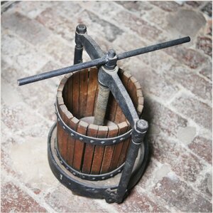 Die kleine Kelter besteht aus einem Biet (Boden der Kelter mit Auffangbecken), einem Gestell aus zwei Metallsäulen und einem darüber liegendem Bügel, der Kurbel und einem Korb für das kleingemahlene Obst aus mit 2 Metallreifen zusammengehaltenen senkrecht angebrachten Holzlatten. Der Kelterkorb steht in einer Metallwanne mit einem Ausguss, Funktionsweise: Um den Saft aus den Früchten (Äpfel, Weintrauben etc.) zu gewinnen, werden diese zuerst in einer (Trauben-)Mühle gemahlen. Danach wird die Maische (die kleinen Obst-Stücke einschließlich der Schalen und Kerne) in den Kelterkorb gefüllt. Dort werden sie durch Anwendung von Druck ausgepresst. Bei dieser Art von Spindelkeltern wird durch Kraftanwendung an zwei üben an der Spindel angebrachten Griffen die Spindel gedreht. Dadurch wird die an der Schraubenspindel befestigte Pressplatte nach unten bewegt und die die Fruchtschnipsel im Kelterkorb zusammenpresst. . Als Folge läuft der Fruchtsaft durch die Spalten des Kelterkorbs in die Metallwanne und durch den Ausguss in ein neben diesem abzustellendem Auffanggefäß. Der Durchmesser des Pressplatte ist etwas kleiner der als der Innendurchmesser des Presskorbs.