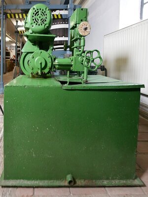 Die grüne Pumpe mit Elektromotor des Herstellers Wilhelm Knod & Co wurde benötigt, um für eine Hydraulische Kelter den notwendigen Wasserdruck zu erzeugen. Das Gerät besteht aus einem Wassertank, einem Sperrhahn, einem Elektromotor, der eigentlichen Pumpe und einer Wasserdruckanzeige. Der Motor wurde zugekauft und hat ein eigenes Typenschild. Die grüne Farbe ist nicht die Originallackierung.