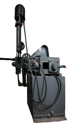 Die blaugraue Pumpe. Sie wurde benötigt, um für eine Hydraulische Kelter den notwendigen Wasserdruck zu erzeugen. Das Gerät besteht aus einem Wassertank, einem Sperrhahn, einem Elektromotor, der eigentlichen Pumpe und einer Wasserdruckanzeige. Die graublaue Farbe ist die Originallackierung.