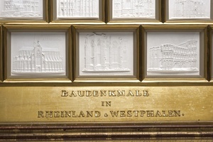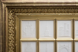 23 Gipsplaketten mit Motiven Sayner Neujahrsplaketten der Jahre 1827 bis 1855 in vergoldetem Holzrahmen hinter Glas.