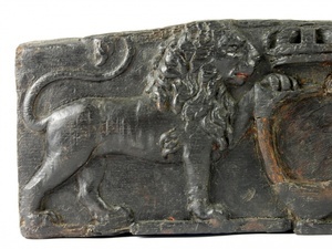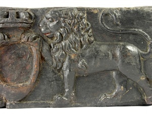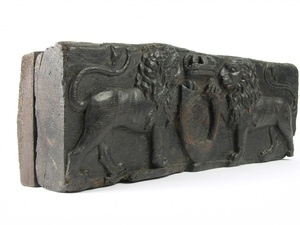 Der Fassriegel stellt zwei stehende Löwen im Hochrelief dar. Sie halten unter einer Krone einen Schild, der die Mittelscheibe umschliesst.