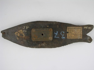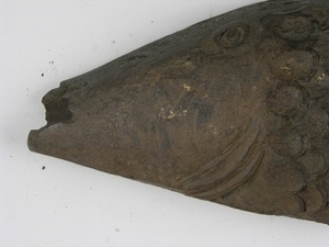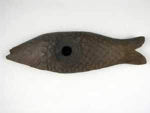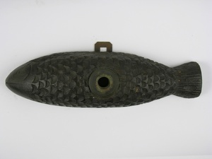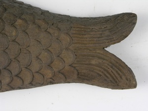 Fisch-Fassriegel, nach links, kräftiger Fisch, mit spitzem Kopf, großen Schuppen und kurzem 2-geteiltem Schwanz.