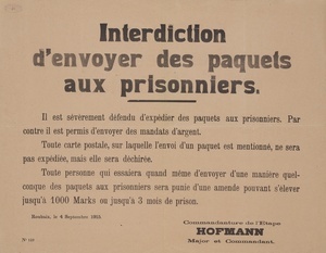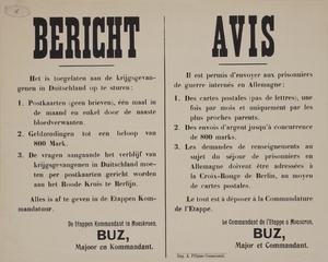Wandanschlag in französischer und niederländischer Sprache. Veröffentlicht im von Deutschland besetzten Belgien, Mouscron, 16. Juni 1915. Den Einwohnern im Umkreis einer Etappe ist es verboten Korrespondenzen zwischen ihnen selbst und zwischen der Etappe und anderen Regionen auszutauschen. Sie dürfen aber pro Monat eine Postkarte an ihre Angehörigen in deutschen Gefangenenlagern schicken. "Avis I. - Il est défendu aux habitants du rayon de l’étape d’échanger des correspondances (lettres, cartes postales, paquets et encois d’argent). A) Entre eux, B) De l’étape à d’autres régions, (par exemple: la Belgique, la Hollande, la France, l’Allemagne). II. - Il est permis aux parents des personnes internées dans les camps de prisonniers en Allemagne d’envoyer à celles-ci une carte postale tous les mois. Ces cartes postales doivent être remises au Commandant de place. Toute autre intervention sera sévèrement punie. Mouscron, le 16 Juint 1915. Buz. Major et Commandant d’Etape."