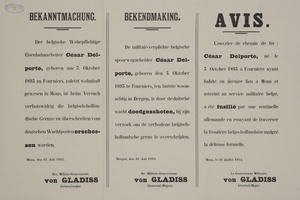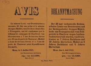 Wandanschlag in deutscher, französischer und niederländischer Sprache. Veröffentlicht im von Deutschland besetzten Belgien; Mons, 30. April 1915. "Durch Urteil vom 27 April 1915 des Feldgerichts der Provinz Hennegau, Zweigstelle Charleroi, ist der Bremser Silvain Jonet aus Lodelinsart wegen Drahtdiebstahls zu 6 Monaten Gefängnis verurteilt worden. Mons, den 30 April 1915. (gez.) von Gladis General Major. Imprimerie Raymond Pinelle, Thuin"