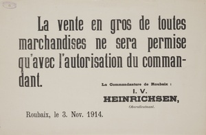 Wandanschlag in deutscher Sprache. Veröffentlicht im von Deutschland besetzten Frankreich; Roubaix, ohne Datum. "Seuche Etappen-Kommandantur, Roubaix."