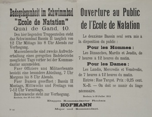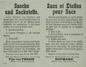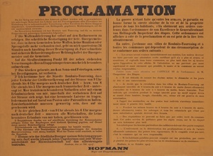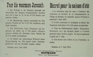 Wandanschlag in deutscher und französischer Sprache. Veröffentlicht im von Deutschland besetzten Frankreich; Roubaix, 22. Juni 1915. "Zapfenstreich Da in einigen Fabriken, welche fuer die deutsche Militaerverwaltung arbeiten, Arbeiter und Arbeiterinnen ohne irgendwelchen Grund die Arbeit niedergelegt haben, verfuege ich folgendes: In den Staedten: Roubaix, Croix, Hem, Lannoy, Leers, Lys, Mouvaux, Toufflers, Wasquehal und Wattrelos haben alle Einwohner von heute ab um 8 Uhr Abends in ihrer Wohnung zu sein. Ebenso muessen alle Geschaefte, Estaminets, Restaurants, usw. zur gleichen Stunde geschlossen sein, falls sie nicht eine besondere Erlaubnis von der Kommandantur Roubaix haben. Dagegen setze ich fuer die Staedte: Anstaing, Baisieux, Bondues, Chereng, Forest, Gruson, Sailly, Tressin und Willems von heute ab den Zapfenstreich auf 9 Uhr Abends fest. Roubaix, den 22. Juni 1915. Etappen Kommandantur Roubaix Hofmann Major und Kommandant."
