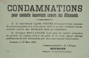 Wandanschlag in französischer Sprache. Veröffentlicht im von Deutschland besetzten Frankreich; Roubaix, 26. März 1915. Für Inschriften an Häusern, die Deutschland beleidigen, sollen, wenn der Verantwortliche nicht gefunden wird, zunächst der Inhaber, dann der Mieter und zuletzt die Inhaber oder Mieter der direkt angrenzenden Grundstücke haften. "Responsabilité du propriétaire et du locataire concernant des inscriptions sur les bâtiments et sur les pasillades Il est arrivé qu’on a fait des inscriptions sur les maisons et sur les palissades contenant des injures contre les Allemands. Si le malfaiteur n’est pas découvert, dans tous ces cas sont responsables: 1). Le propriétaire du terrain. 2). Le locataire du terrain. 3). Les propriétaires et les locataires des terrains les plus proches à droite et à gauche. Ceux que j’ai rendus responsables ne peuvent pas empêcher que des inscriptions de ce genre ne soient pas faites par des vauriens, mais ils peuvent prendre soin que ces inscriptions injurieuses soient tout de suite enlevées. Je leur ordonne cela comme devoir et s’ils contreviennent à ce devoir ils se rendent complices de ce délit et seront punis. D’après ce principe René Lamarque de Roubaix a été puni le 25 Mars d’une amende de 500 francs parce qu’il a laissé pendant plusieurs jours, au lieu de l’enlever, une inscription injurieuse envers les Allemands, écrite sur la palissade d’un terrain loué par lui. Roubaix, le 26 Mars 1915. Commandanture de l’Etape. Hofmann Major et Commandant N° 76."