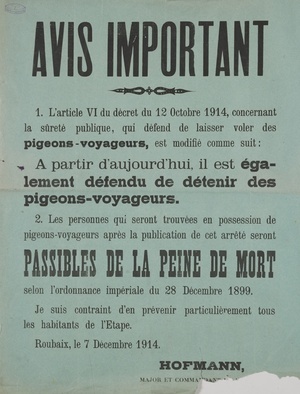 Wandanschlag in französischer Sprache. Veröffentlicht im von Deutschland besetzten Frankreich; Roubaix, 28. Dezember 1914. Alle Passierscheine, die bis 28. Dezember 1914 ausgeliefert sind, sind nicht mehr gültig und müssen erneuert werden. "Avertissement Tous les laisser-passer, délivrés jusqu’au 28 Décembre 1914, ne sont plus valables quelle qu’en soit la durée. Ils doivent être revouvelés. Roubaix, 28 Décembre 1914. Hofmann Major et Commandant."